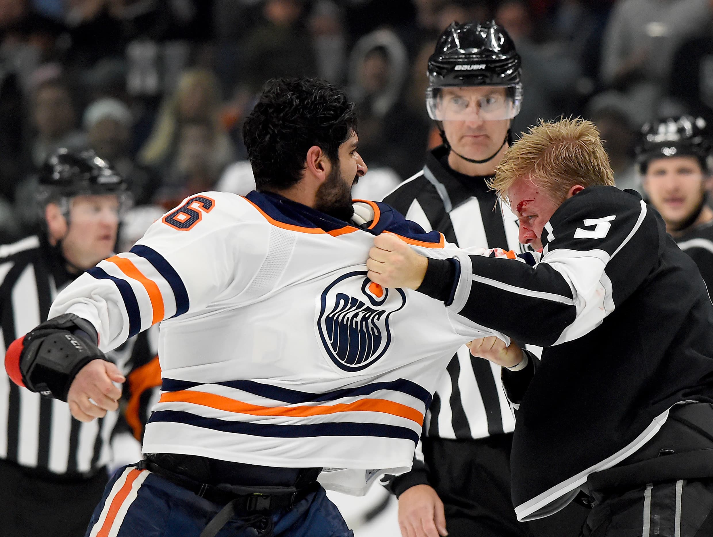 Feb 7, 2018; Los Angeles, CA, USA; Los Angeles Kings defenseman Christian Folin (5) and Edmonton Oilers left wing Jujhar Khaira (16) fight in the first period at Staples Center. Mandatory Credit: Jayne Kamin-Oncea-USA TODAY Sports