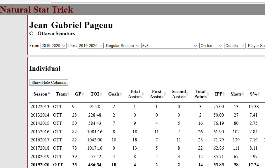 @Jean Gabriel Pageau is the most recent shiny free agent toy that everyone is talking about. He is a good player. No doubt he will help your team, but he likely will get an overpriced raise in free agency as teams are always desperate to improve on July 1st and 2nd. Let’s take a quick look at his production.