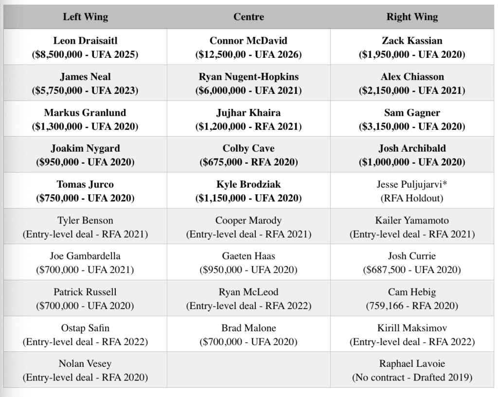 The team only has three current roster forwards under contract beyond the 2020-21 season and there’s a very real chance one of those three, James Neal, could be bought out. Connor McDavid and Leon Draisaitl really are the only sure things when pondering the future of the Oilers’ forwards. After this season, Sam Gagner, Zack Kassian, Markus Granlund, Kyle Brodziak, Josh Archibald, Joakim Nygard, Gaetan Haas, and Tomas Jurco will be unrestricted free agents. After the following season, Ryan Nugent-Hopkins and Alex Chiasson’s contracts will also expire.