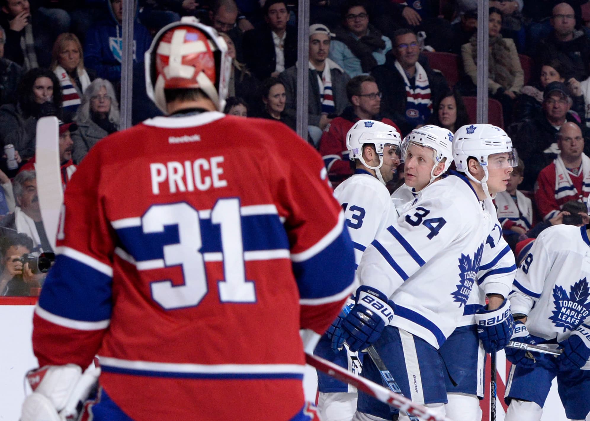 Oct 29, 2016; Montreal, Quebec, CAN; Toronto Maple Leafs forward Nazem Kadri (43) reacts with teammates Zach Hyman (11) and Auston Matthews (34)after scoring a goal against Montreal Canadiens goalie Carey Price (31) during the third period at the Bell Centre. Mandatory Credit: Eric Bolte-USA TODAY Sports