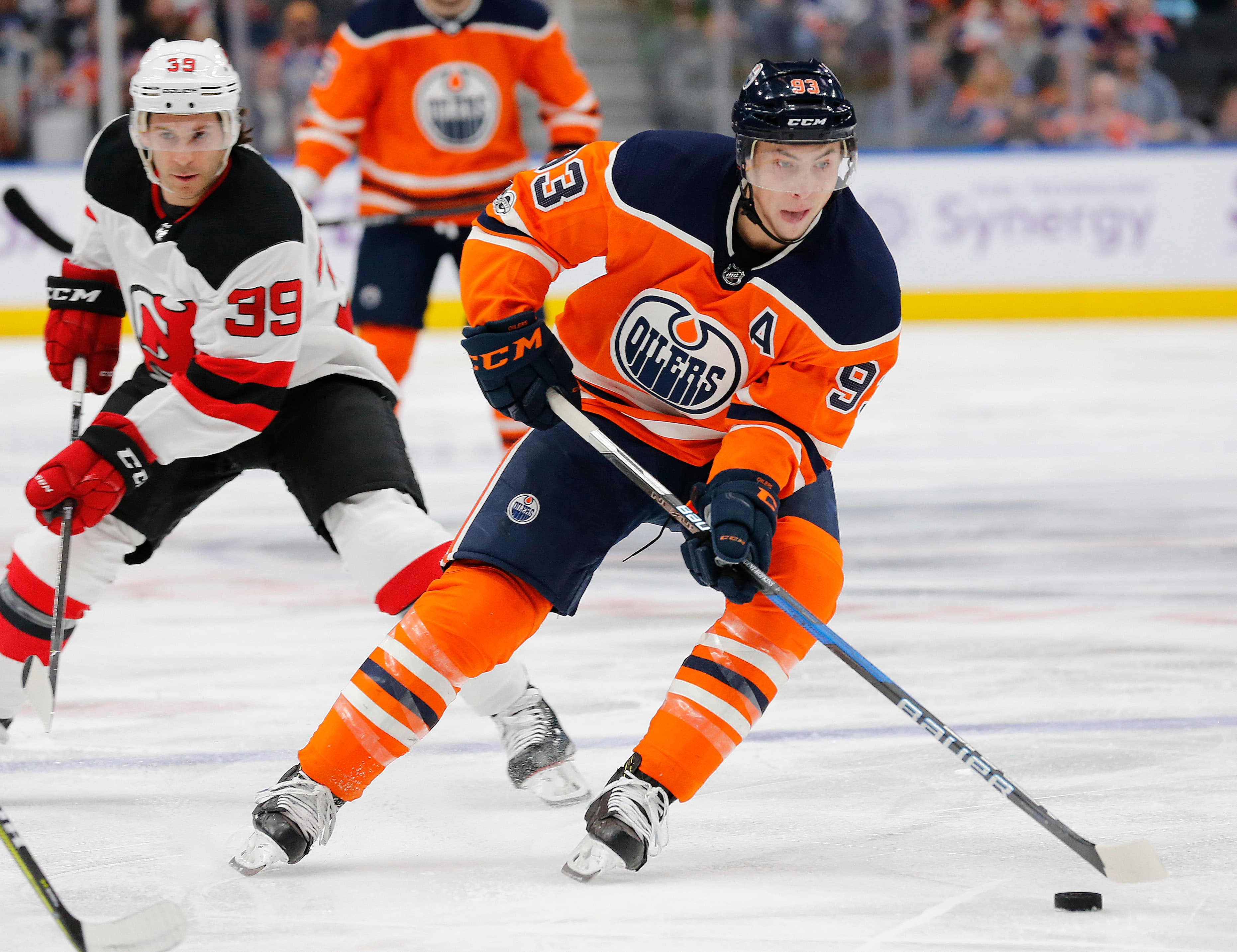 Nov 3, 2017; Edmonton, Alberta, CAN; Edmonton Oilers forward Ryan Nugent-Hopkins (93) skates with the puck against the New Jersey Devils during the first period at Rogers Place. Mandatory Credit: Perry Nelson-USA TODAY Sports
