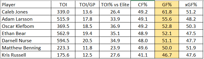 Larsson played top-four minutes and outscored the opposition 25-20. Only Jones (21-13) was better. (They could make a very solid pair to start the season). Larsson isn’t flashy, but when healthy he is very effective. I see his back injuries as more of a factor when it comes to determining his next contract, than I do his ability to play sound defence this year. If Larsson can play the majority of this season, the Oilers chances of winning increase, especially if his back issues don’t flare up.
