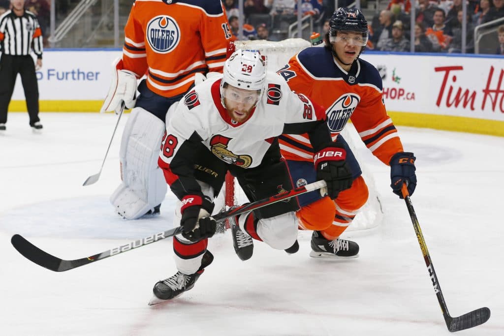 Dec 4, 2019; Edmonton, Alberta, CAN; Ottawa Senators forward Connor Brown (28) and Edmonton Oilers defensemen Ethan Bear (74) chase a loose puck during the second period at Rogers Place. Mandatory Credit: Perry Nelson-USA TODAY Sports