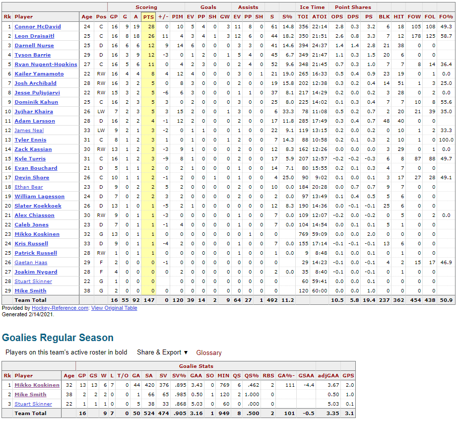 Despite that, Edmonton’s goaltending faltered. Mikko Koskinen had a tough stretch fighting the puck while Stuart Skinner allowed five goals in his first NHL start. Edmonton was lucky in that they were able to play the Ottawa Senators a bunch and those are games that allowed some of the numbers to rebound.