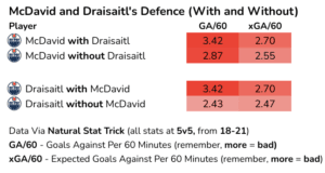 No matter how you look at it, both of these two superstars are superior offensively when on the same line. McDavid’s dazzling play-making and Draisaitl’s deadly shooting abilities are an excellent match. The duo has a Goals For per hour of 4.37 in the past three seasons, which is almost 1.8x the league average GF/60 of 2.45.