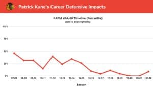 Even though RAPM attempts to adjust for teammates, Kane’s recent defensive impacts are likely still affected by the poor team around him, to an extent. Still, Kane has never managed to post positive defensive results throughout his fifteen-year NHL career, regardless of how strong his team was.