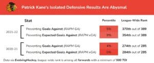 In the past two seasons, Kane’s isolated impact on preventing both goals and expected goals is dreadful. With Kane on ice, the Blackhawks allow a significantly higher amount of goals and scoring chances as opposed to without.