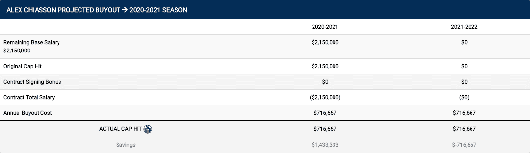 Alex Chiasson has the lowest cap hit of the three as he is owed just $2.15 million for one more season. Here is what his buyout would look like: