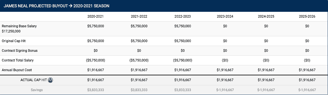 James Neal is the other big name that gets thrown into buyout conversations. He has three more seasons on his contract with a cap hit of $5.75 million. If they bought him out this summer, it would look like this: