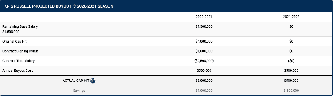 Let’s start with Russell. If the Oilers bought him out, here’s how it would impact their cap situation: