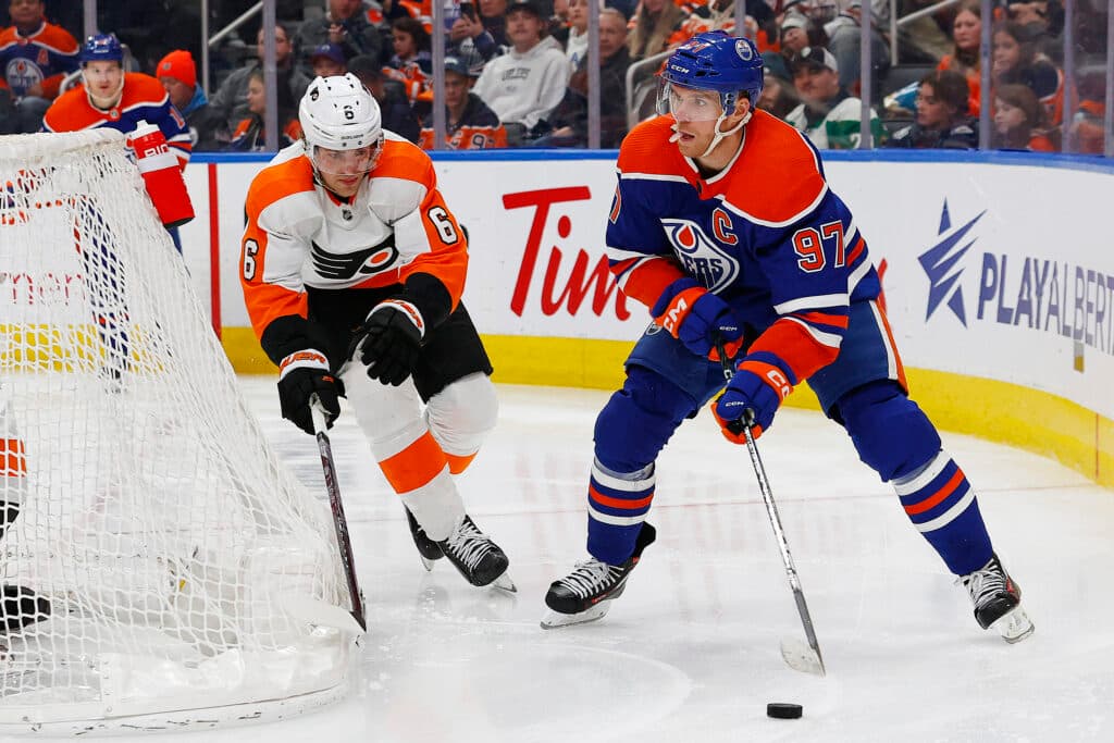Feb 21, 2023; Edmonton, Alberta, CAN; Edmonton Oilers forward Connor McDavid (97) passes in front of Philadelphia Flyers defensemen Travis Sanheim (6) during the third period at Rogers Place. Mandatory Credit: Perry Nelson-USA TODAY Sports