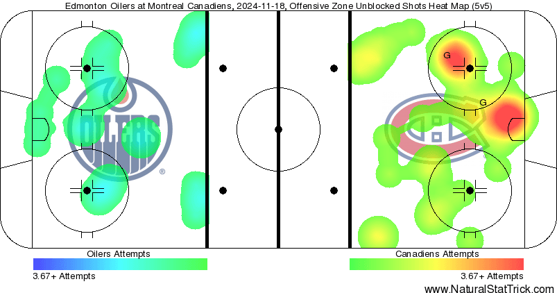 Though the game in Toronto on Saturday saw the wheels fall off the Oilers in the third period following a strong effort, Monday’s match in Montreal didn’t feature the same type of energy from Edmonton. According to Natural Stat Trick, the Oilers managed just four high-danger scoring chances at even-strength against the Habs, well below the average of 12.3 high-danger chances they’ve been averaging per game this season.