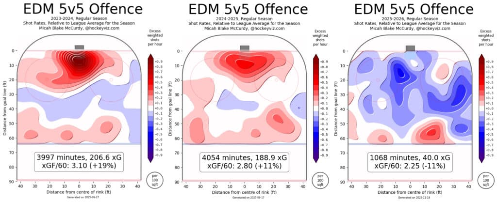 So many of the Oilers’ shots coming from low-percentage areas and while they are generating rebounds, Edmonton’s struggled to clean them up. The team had a similar number of shots from defencemen last year with the team at 36.3 percent, but the Oilers forwards averaged 9.2 high-danger scoring chances per game. That number has dropped to a measly 6.5 per game this season.