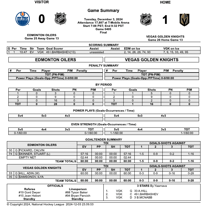 The win put Vegas at 16-7-3 on the season, while the Oilers moved to 13-10-2 after their three-game winning streak was snapped. The Golden Knights lead the Pacific Division with 35 points, four up on the Los Angeles Kings, five up on the Vancouver Canucks and Calgary Flames, and seven clear of the Oilers.