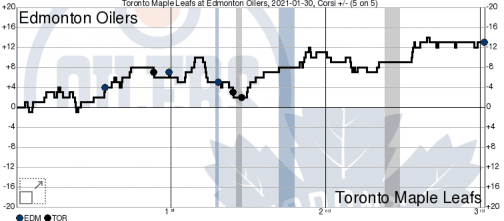 The Oilers had 52 shot attempts at even strength while the Leafs had 39 and Edmonton dominated in terms of high danger chances with 13 while Toronto had six. Every single Oiler except for Josh Archibald and Devin Shore were in the green in terms of shot attempt differential and those two finished 8-to-9 and 4-to-4 respectively.