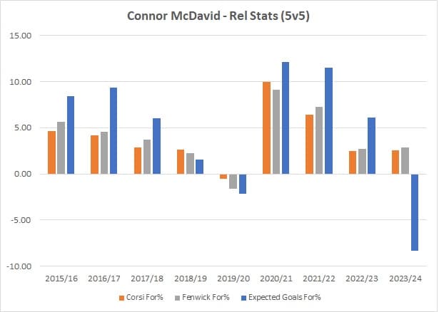 The one area we know McDavid excels at is his ability to tilt the ice in favour of the Oilers when it comes to generating shots and chances, specifically at even-strength (5v5). His unique talent increases the odds of the Oilers out-scoring opponents as the team consistently creates more high-quality shots from higher-scoring probability areas. This is reflected in his strong on-ice share of expected goals, which factor in shot type and location to determine the probability of shots becoming goals. The Oilers have always done better at creating these chances with McDavid on the ice than without him, and he was supposed to continue being his dominant self this season.