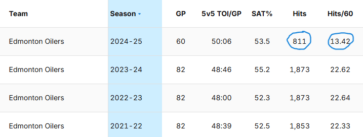 The Oilers are dead last in hits — by a large margin. They’ve never led the hit parade, and that is fine, but in 2021-22 they were 15th, they were 16th in 2023, and they were 15th last season. That was quite consistent, and they rarely got ran out of the rink or pushed around.