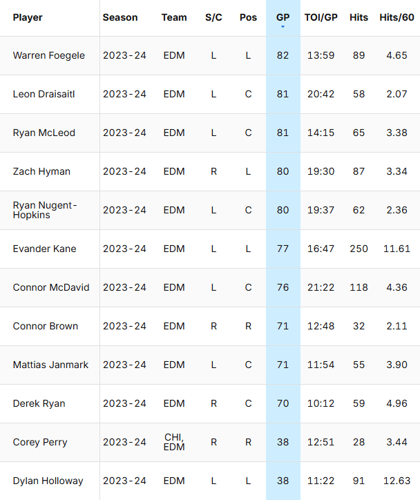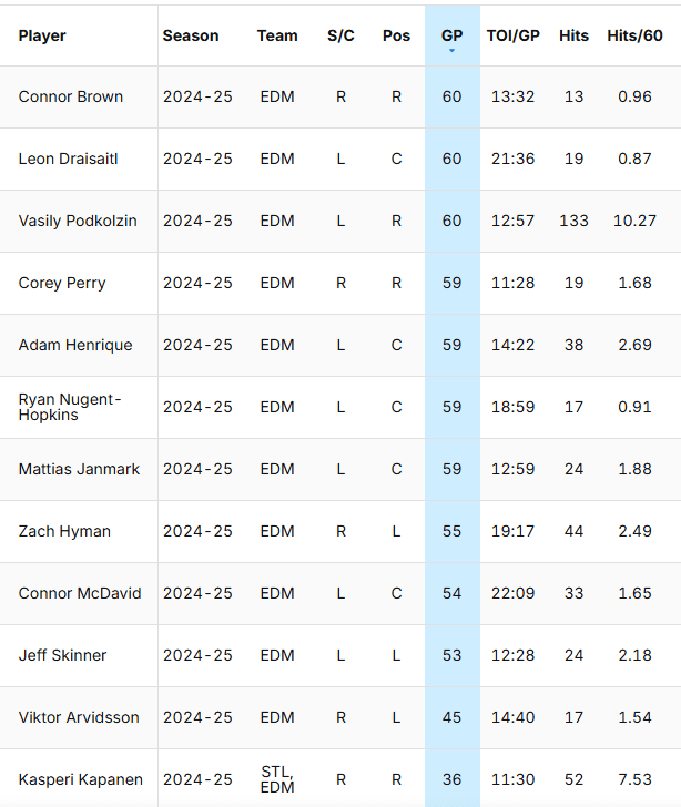 Foegele, Kane, McLeod and Holloway had a combined 495 hits, with Kane having 250. The new four players have combined for 232. Podkolzin and Kapanen rank first and second on the Oilers in hits this year with 133 and 52 respectively. Kapanen being second with 52 is wild.