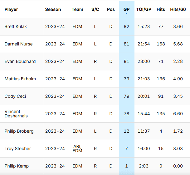 Across the board, every forward is down. Some of these players have never been overly physical, so I don’t suddenly expect them to be. I don’t need Leon Draisaitl delivering hits regularly, but even he’s down over 50%.