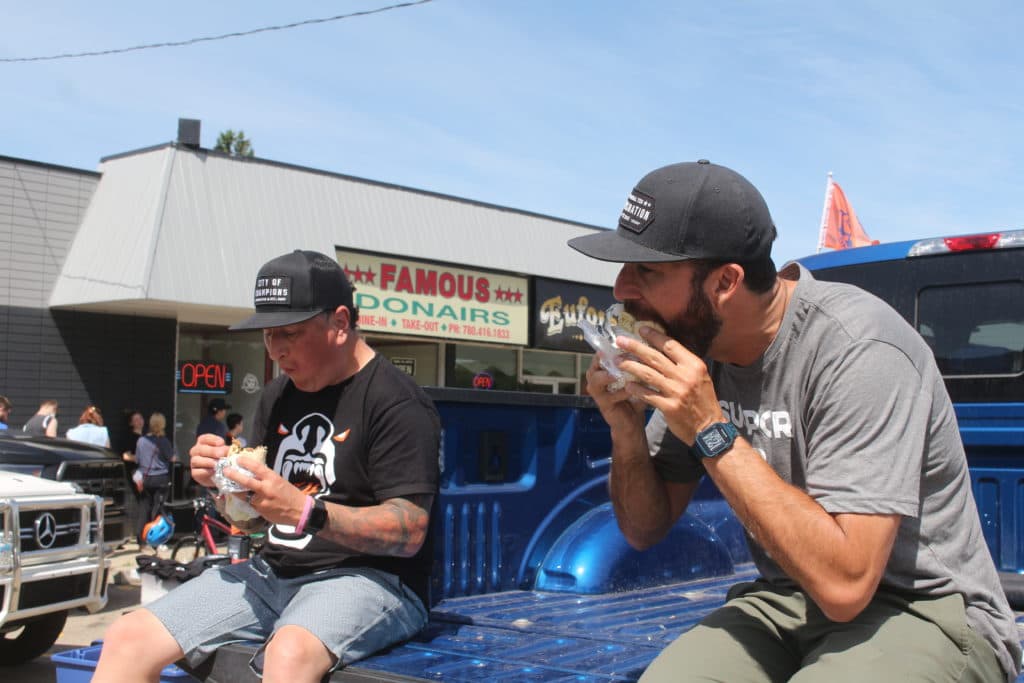 Jarrod and Jay dig into some socially distanced donairs on the back of the Nation Truck.