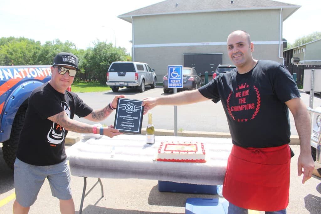 Famous Donair owner Nick, right, gets presented the championship plaque for the 2020 Nation Donair championship.