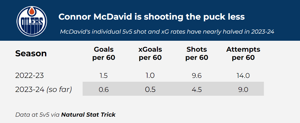 Now, McDavid’s passing has generally been fine, as he leads the team with 12.1 scoring chance assists per 60. But McDavid’s individual shooting has significantly decreased, as he is averaging 5.1 shots per 60 less, and his expected goals per 60 has essentially halved. As a result, he has just one 5v5 goal in 151 minutes, a far cry from his excellent 1.5 5v5 goals per 60 rate last season. He does not look like the 64-goal scorer from 2022-23.
