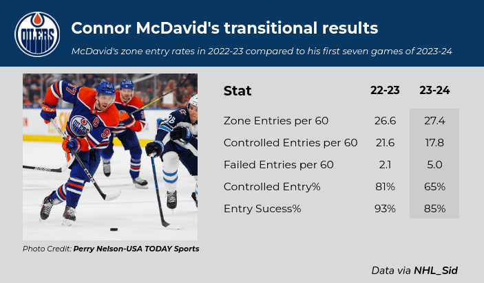 McDavid simply hasn’t attacked the offensive zone at the same speed and precision as he usually does, and opposition defenders have had a much easier time limiting and defending him off the rush. That’s a big reason as to why Edmonton isn’t generating as much off the rush this year.