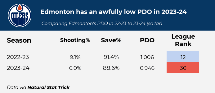 PDO is a stat combining shooting percentage and save percentage and is often used as a proxy for puck luck. Typically, a team with average luck would have a PDO of about 1.00. When it comes to the Oilers, they rank third last in the league with a PDO of 0.946.