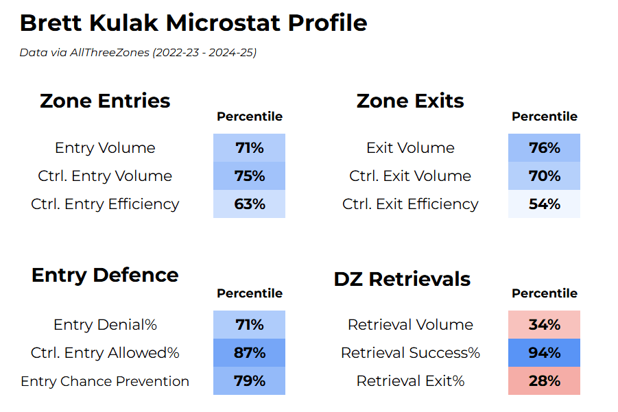 It is a big jump from making zone exits as a third-pairing defenceman against weaker competition, compared to exiting the zone against top-four competition with a significant chunk of your shifts on your off-side. Thus far, Kulak has been fine at exiting the zone, but again, these results are quite early.