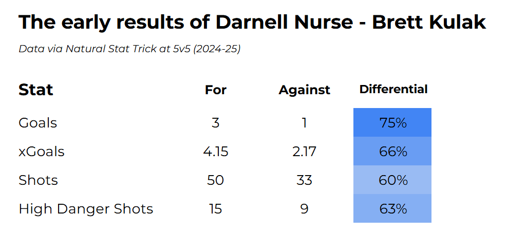 With a 66 percent expected goal share, alongside a 3 to 1 goal differential, Nurse and Kulak have thoroughly outplayed the opposition when on-ice together. They could actually have something here.