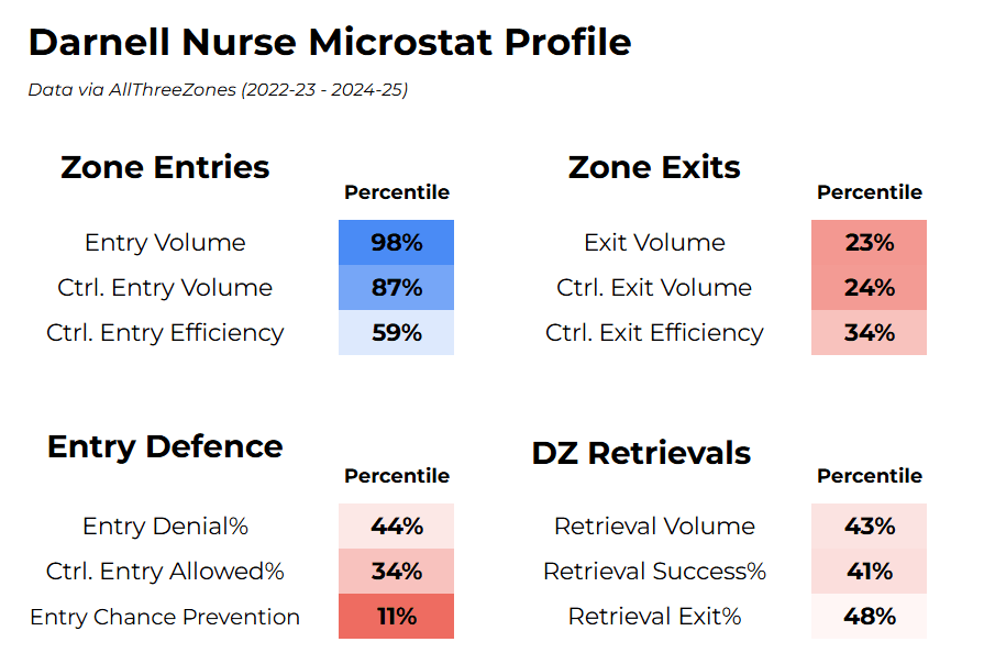 To determine whether two defenceman could stylistically fit together on a defensive pair, I often like to use microstats, which are essentially statistics relating to specific individual actions, such as zone entries, zone exits, and so on. Corey Sznajder has operated a microstat tracking project for about a decade now (highly recommend checking out his work), and using his data, here is a brief microstat profile for Nurse: