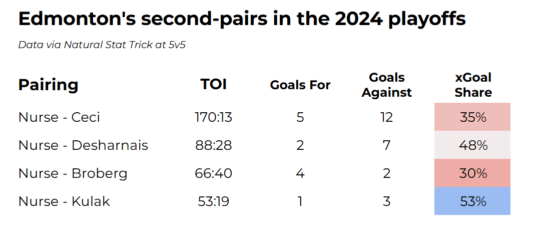 From 2022-23 through 2023-24, Darnell Nurse and Cody Ceci were primarily Edmonton’s second-pair. In the regular-season, they narrowly managed to scrape a positive 5-on-5 goal differential in that span, playing on a team that was a huge net positive, while they also possessed some of the league’s worst defensive results against elite competition. The postseason results are even worse; in the past two playoffs, the Oilers have been out-scored 24 to 36 at 5v5 with Nurse on-ice. Meanwhile, with Nurse on the bench, the Oilers are up 53 to 42.