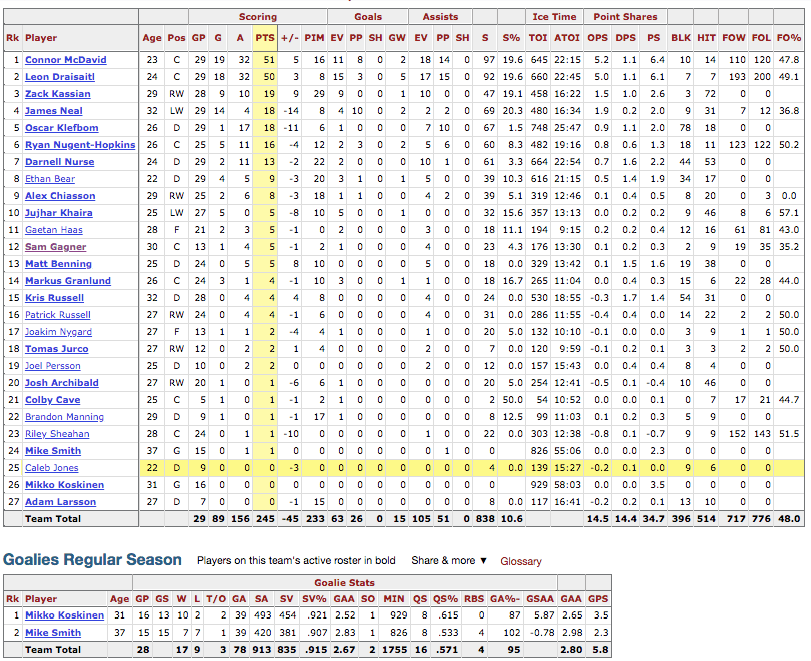 The organization as a whole has always seemed to struggle in the possession game and this year is no different. Team PDO of 101.6 is still a little bit high, but we’ve seen Edmonton’s save percentage fall from .921 in the first 15 games, to .896 over the last 14 equating for the drop.