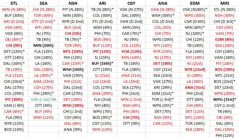 Edmonton plays BTB twice and three of their next five games are against a team playing the second half of a BTB. Edmonton plays 11 games v. teams currently in the playoffs. Seattle plays the fewest (8), while St. Louis, Minnesota and Anaheim each play 13. The Blues also play the most games (5) v. an opponent on the second night of a BTB.