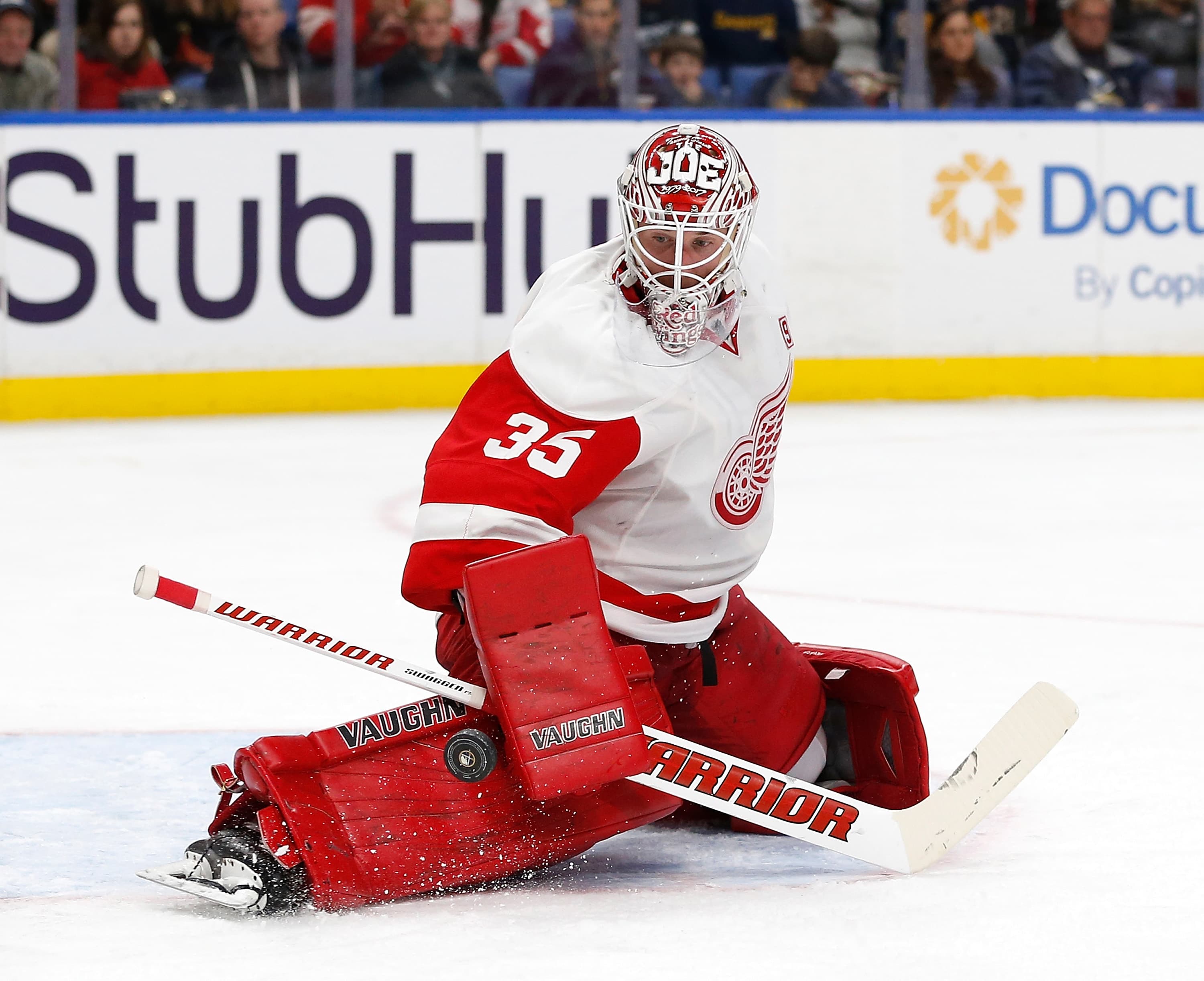 Nov 23, 2016; Buffalo, NY, USA; Detroit Red Wings goalie Jimmy Howard (35) makes a save against the Buffalo Sabres during the second period at KeyBank Center. Mandatory Credit: Kevin Hoffman-USA TODAY Sports