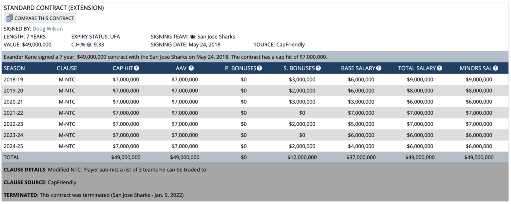 We don’t know exactly what the Sharks paid Kane in their one-time payout, but it could involve the two different $2 million signing bonuses he was due in 2022-23 and 2024-25…