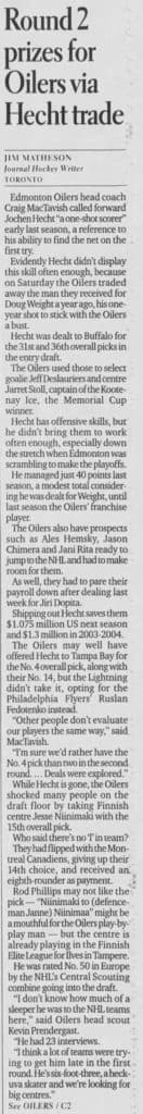 Edmonton made two daft choices taking G Jeff Drouin-Deslauriers 31st overall and C Jarret Stoll 36th overall.