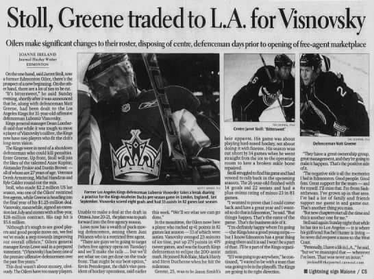 Stoll’s time in Edmonton came to an end in 2008, when along with D Matt Greene, he was traded to the LA Kings for D Lubomir Visnovsky.