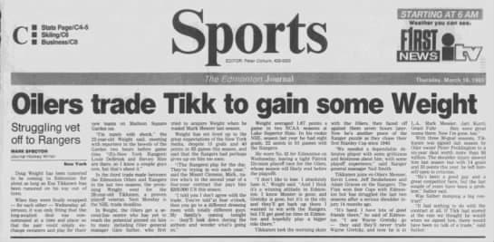 On March 17, 1993, the Oilers traded Tikkanen to the @New York Rangers in a one-for-one deal for @Doug Weight. The deal was straight forward and Edmonton shipped off Tikkanen, who wasn’t performing to expectations for a young centre in Weight, who despite scoring 40 points in 65 games in his rookie year with the Rangers, was underperforming.