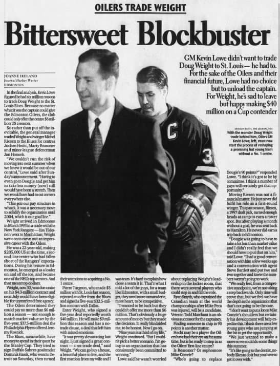 The Weight era came to an end on July 1, 2001 when, largely for financial reasons, the Oilers had no choice but to ship him off for the best possible offer. It was deal that saw Edmonton recieve forwards Marty Reasoner and Jochen Hecht, and defenceman Jan Horacek for Weight and prospect Michel Riesen.