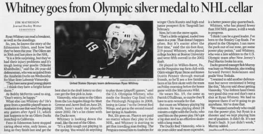 Whitney was in Edmonton for four seasons scoring 59 points in only 139 injury-plagued games and eventually left the Oilers in free agency to sign with the Florida Panthers in 2013.
