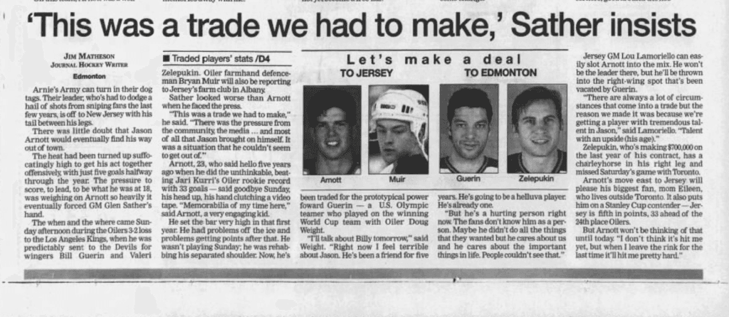 This trade was part of a mid-season shake-up for the Oilers. Just a few days earlier, the Oilers had dealt two former top draft picks, Jason Bonsignore and Steve Kelly, to the Tampa Bay Lightning in exchange for Roman Hamrlik and Paul Comrie. Within a span of under a week, the Oilers’ top picks from the 1993, 1994, and 1995 drafts were gone.