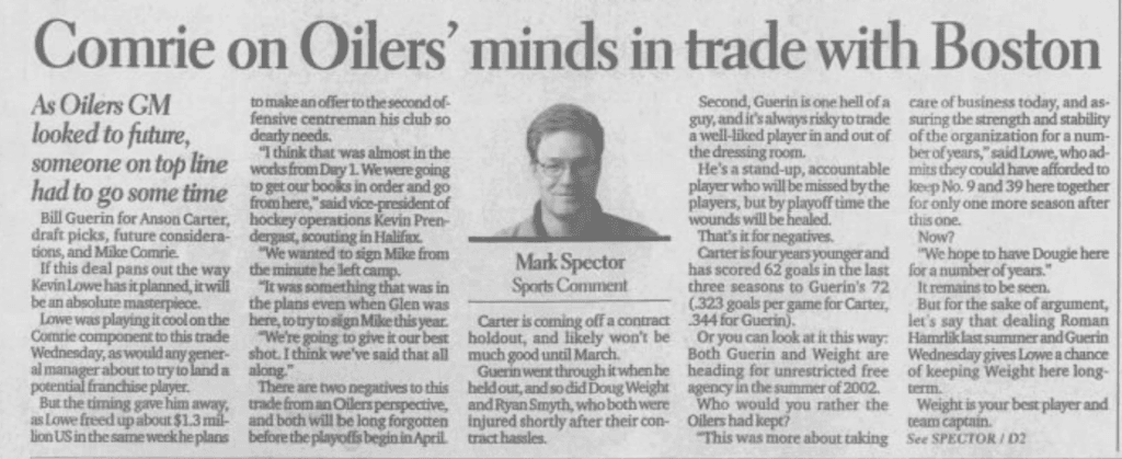 A little over a month into the 2000-01 season, Guerin was shipped to Boston along with Edmonton’s 2001 first-round pick for Anson Carter and Boston’s 2001 first- and second-round picks. Also, elsewhere in this trade tree, Zelepukin was sent to Philadelphia for Daniel Lacroix, who only played a few games in Edmonton. This deal had a lot of ramifications for the eventual 2006 Stanley Cup Final run team.