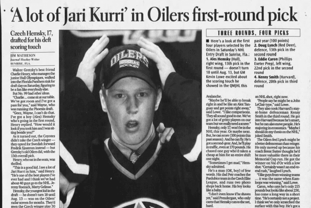 Circling back, the Oilers got Anson Carter, a late-bloomer, power-forward winger in exchange for Guerin along with a couple of draft picks. They used the first-rounder on Ales Hemsky and the second-rounder on Doug Lynch.