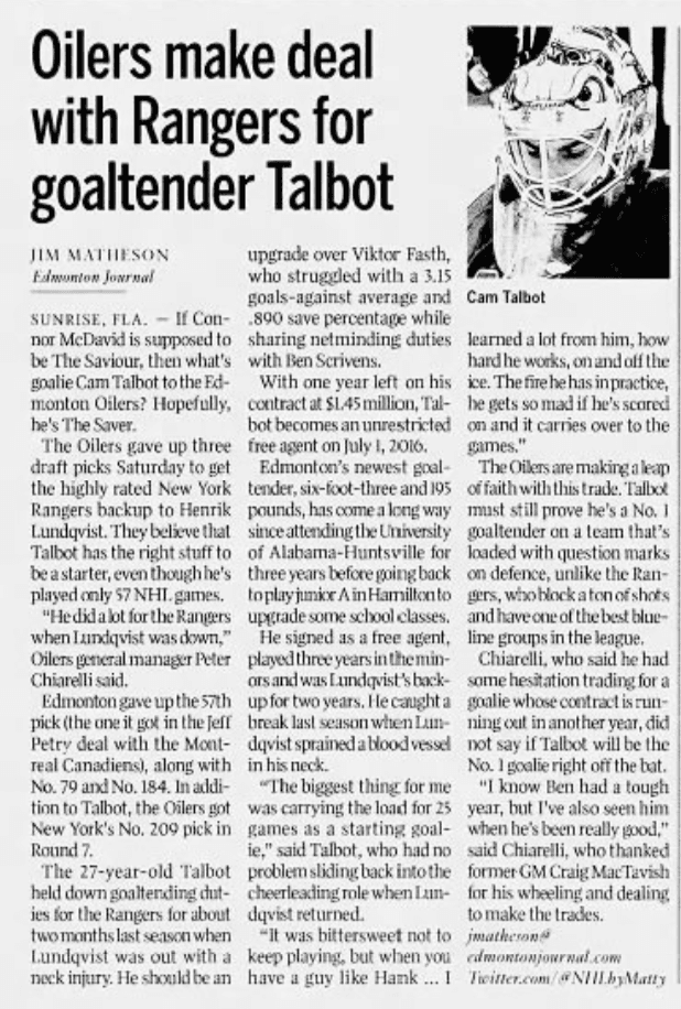 Lost in the excitement of drafting Connor McDavid with the first pick in 2015 was the under-the-radar acquisition of Cam Talbot, the understudy of Henrik Lundqvist who had thrived as a backup in New York. The Oilers sent that third they acquired from Ottawa for Hemsky along with two other draft picks to acquire Talbot.