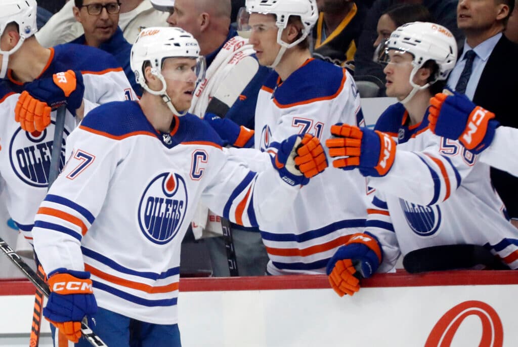 Feb 23, 2023; Pittsburgh, Pennsylvania, USA; Edmonton Oilers center Connor McDavid (97) celebrates with the Oilers bench after scoring a goal against the Pittsburgh Penguins during the first period at PPG Paints Arena. Mandatory Credit: Charles LeClaire-USA TODAY Sports