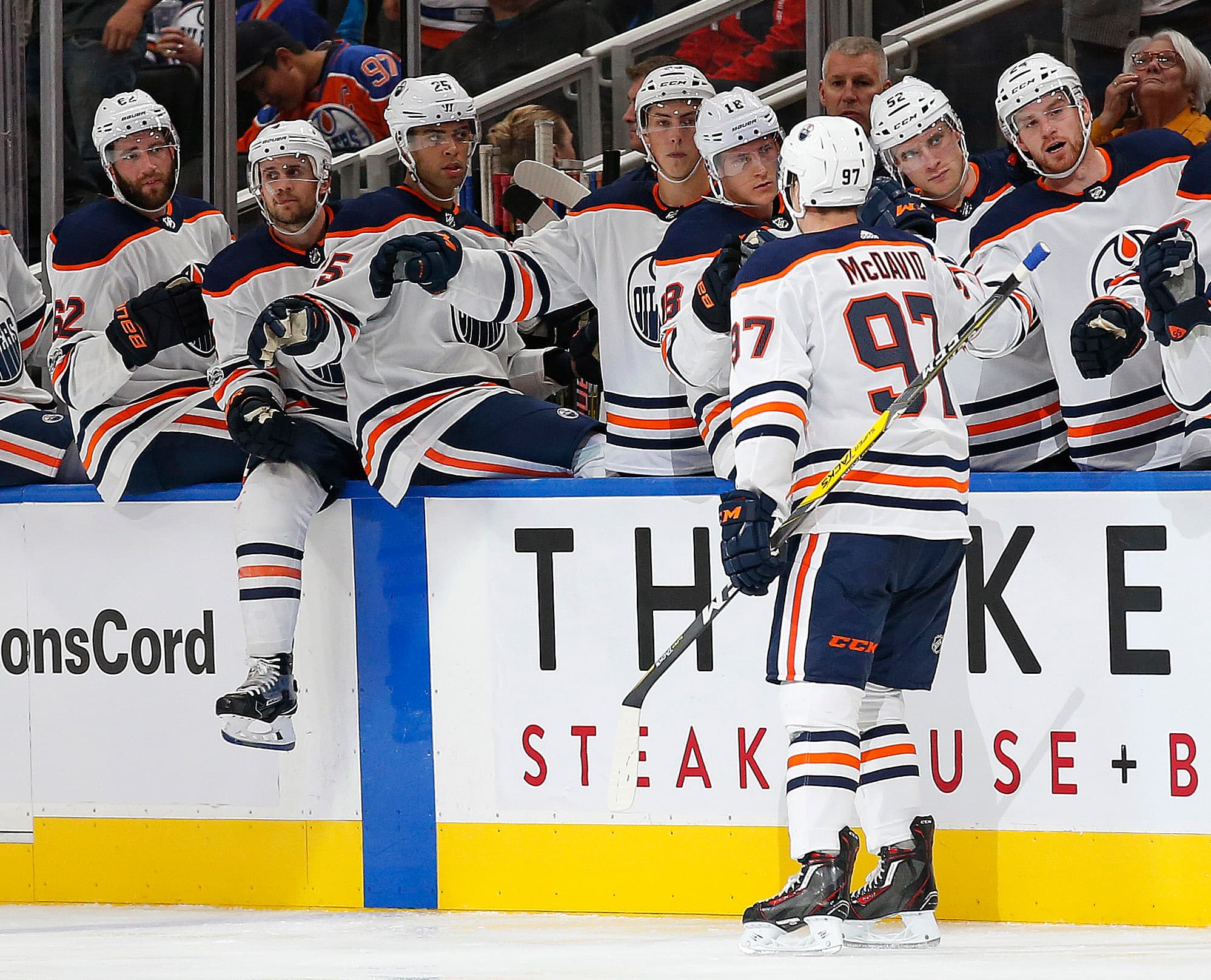 Sep 23, 2017; Edmonton, Alberta, CAN; Edmonton Oilers forward Connor McDavid (97) celebrates a third period goal against the Winnipeg Jets at Rogers Place. Mandatory Credit: Perry Nelson-USA TODAY Sports