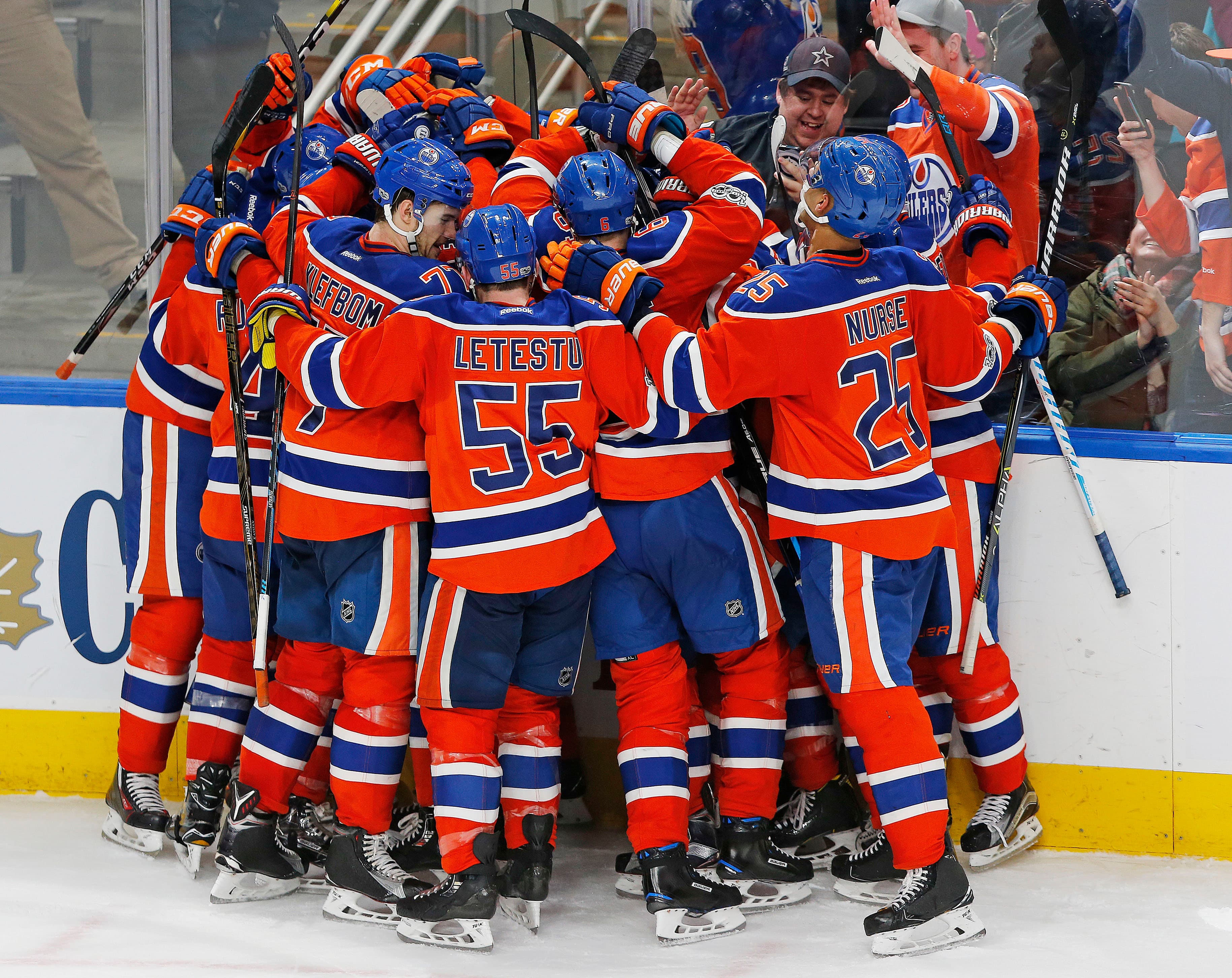 Apr 1, 2017; Edmonton, Alberta, CAN; The Edmonton Oilers celebrate an overtime goal by forward Leon Draisaitl (29) against the Anaheim Ducks at Rogers Place. Mandatory Credit: Perry Nelson-USA TODAY Sports