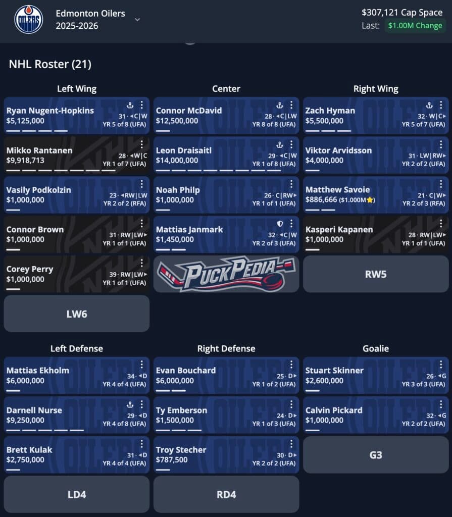 The Oilers would need to bring some players back to help fill out the roster, so all of Corey Perry, Kasperi Kapanen, Connor Brown and Noah Philp re-sign on a one-year, $1-million deal, while Ty Emberson gets a three-year, $1.5-million AAV extension. That leaves the Oilers with just $3.725-million in cap space — just a little shy of the MacKinnon benchmark.
