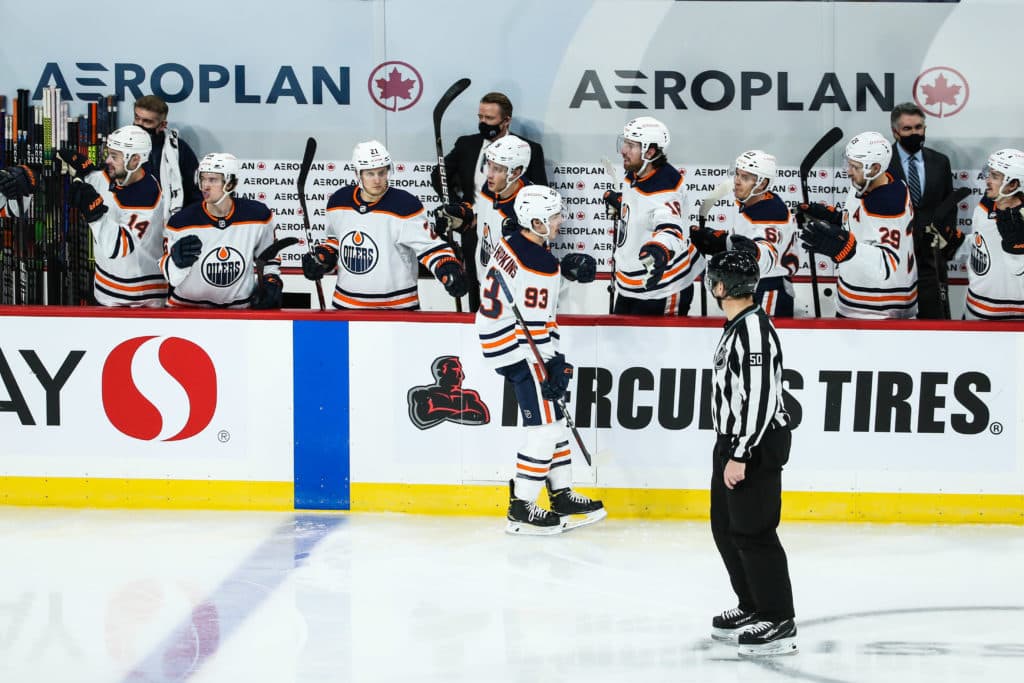 Jan 24, 2021; Winnipeg, Manitoba, CAN; Edmonton Oilers forward Ryan Nugent-Hopkins (93) is congratulated by his team mates on his goal against the Winnipeg Jets during the second period at Bell MTS Place.